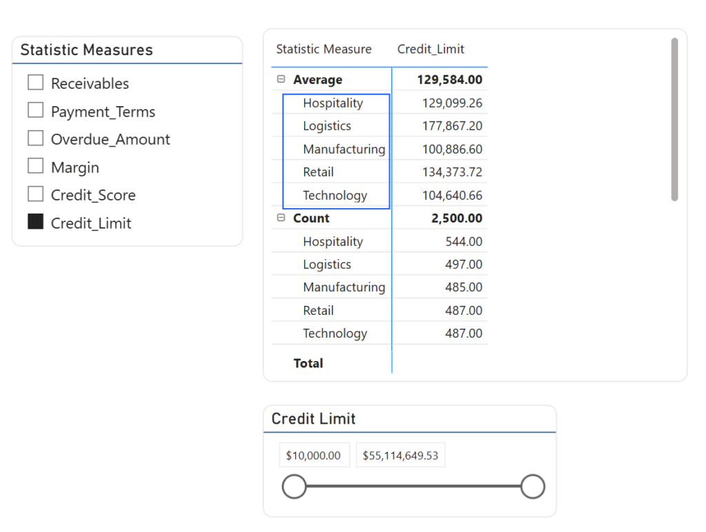 To avoid building a separate table for every metric, I used Field Parameters. This bundles my individual “Statselector” measures into one dynamic filter. This allows the user to toggle between Margin, Credit Limit, and Receivables in the same visual space.