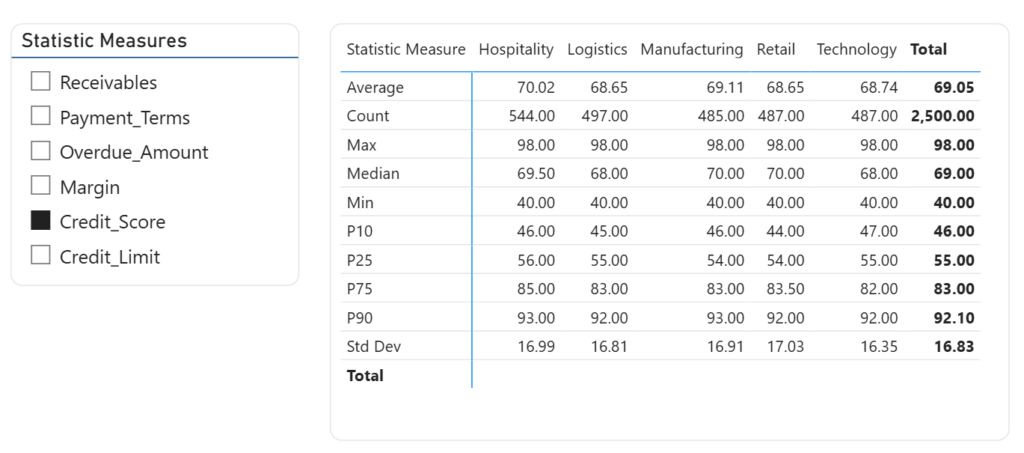 Automatic Intersection: The matrix automatically calculates the P10 or Median specifically for “Hospitality” “Logistics” and all other categories.